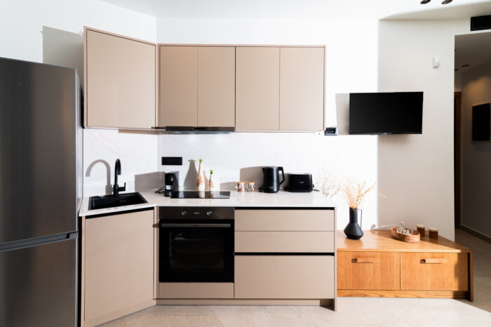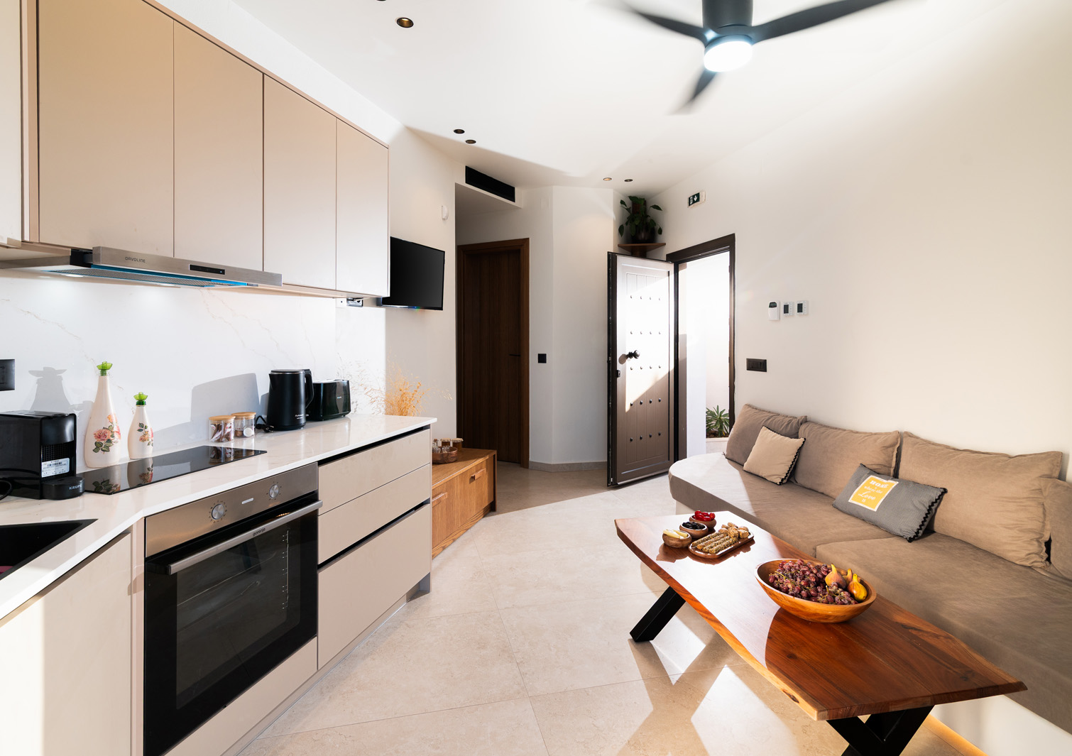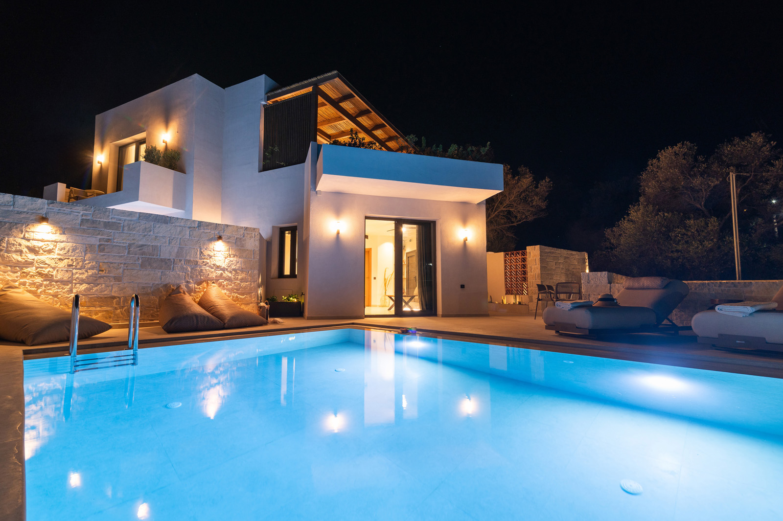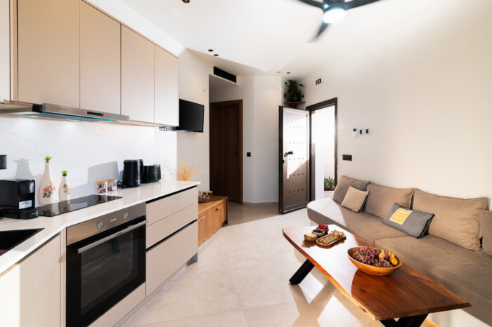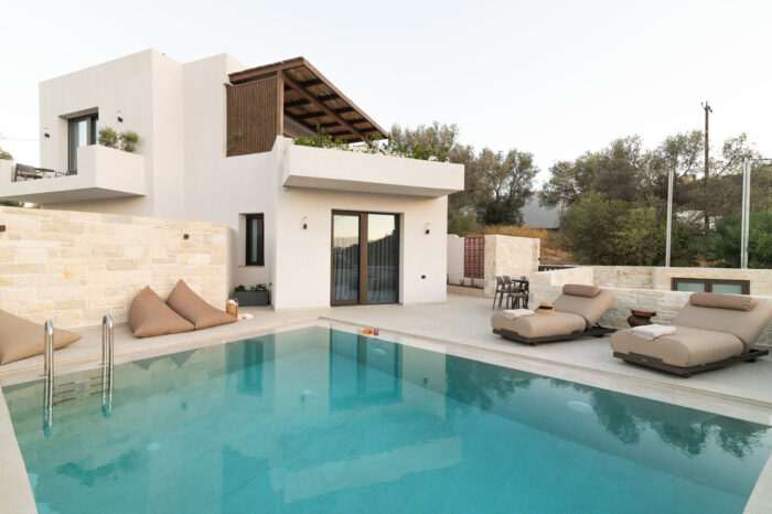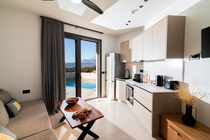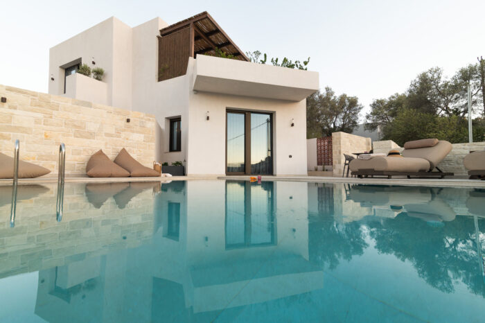 A cozy elevated ground-floor house of 55 sq.m. with a private pool and courtyard overlooking the sea. Ideal for families or groups up to 5 guests, offering modern amenities, fully equipped kitchen, and private parking