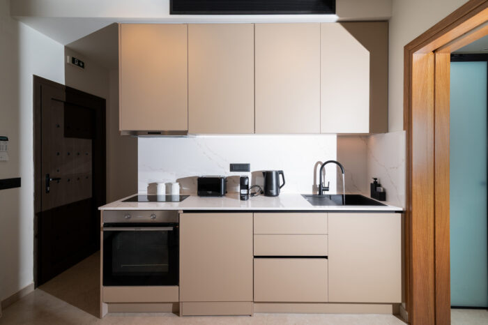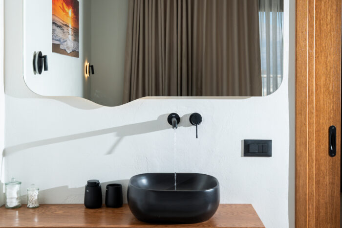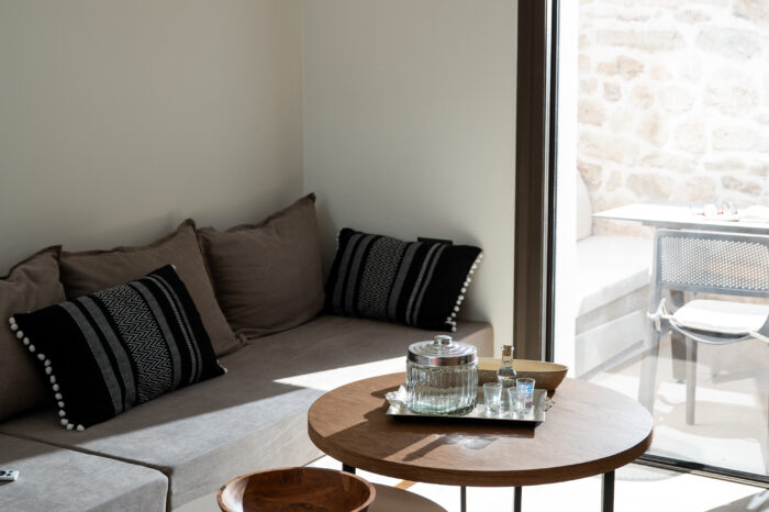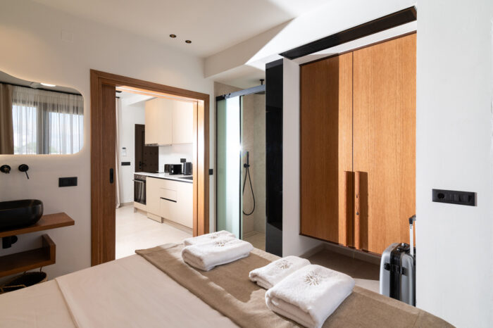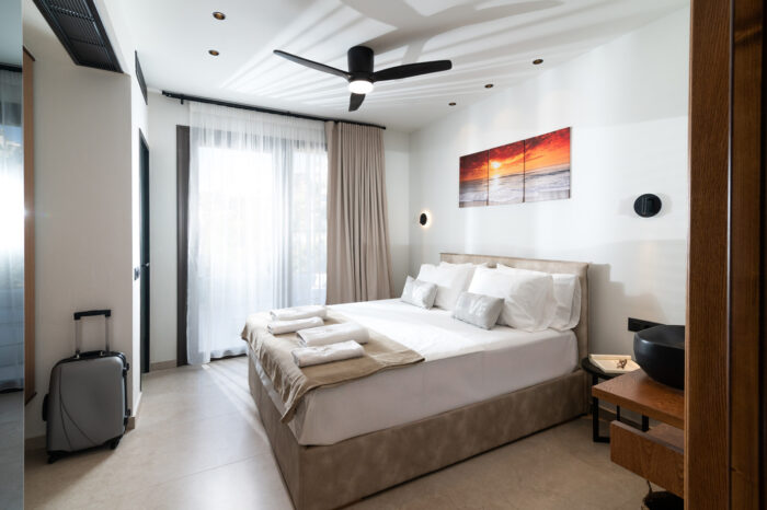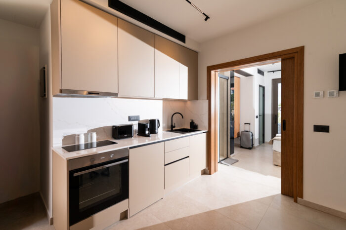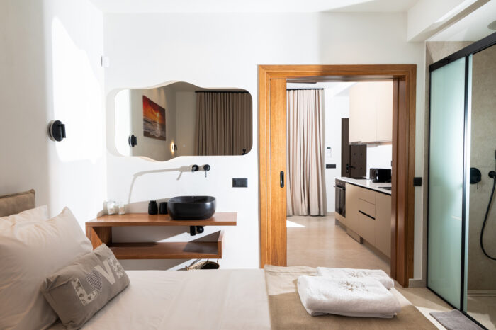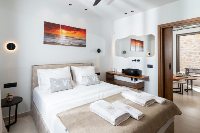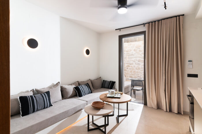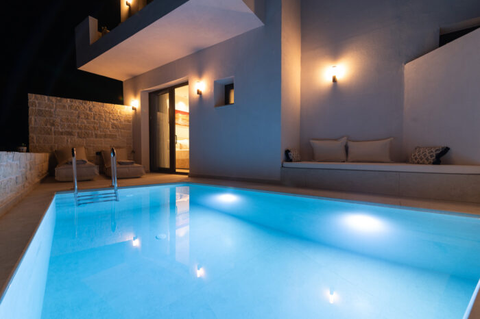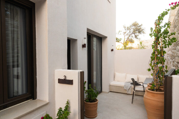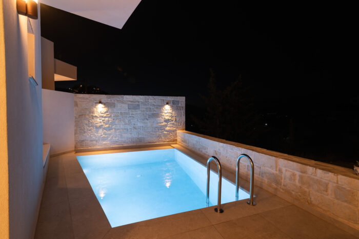A stylish 35 sq.m. suite with private pool and sea view. Designed for couples or small families up to 3 guests, featuring a charming inner courtyard, modern comforts, and a cozy atmosphere for a tranquil getaway.